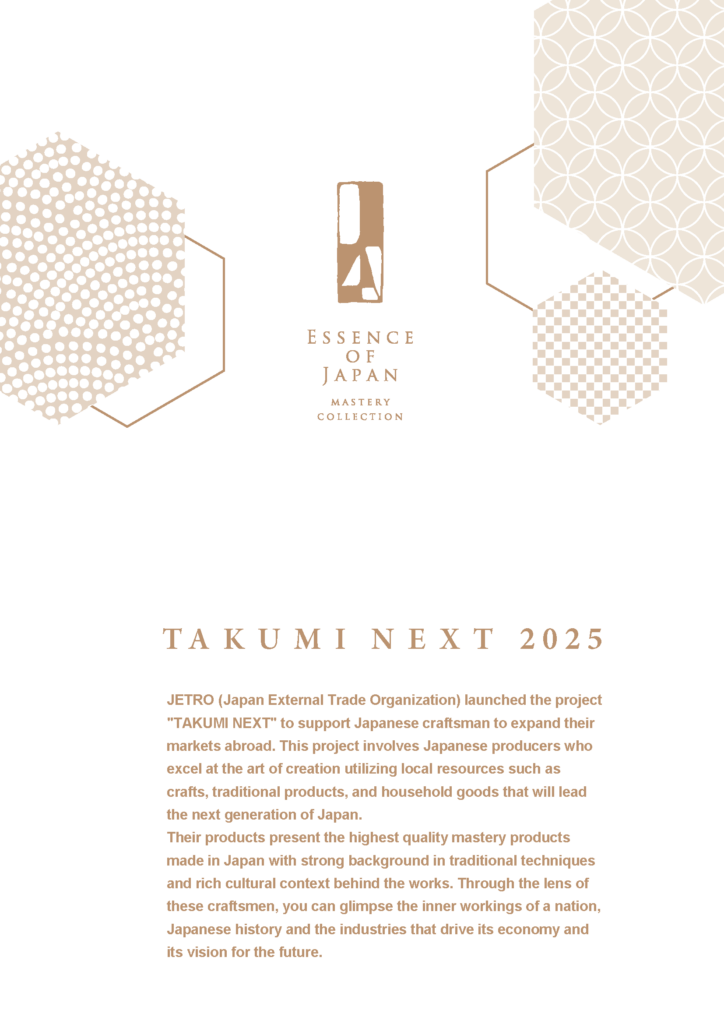「TAKUMI NEXT」は、日本貿易振興機構(JETRO)が2019年度から実施しており、地域資源を活用した高付加価値商材の海外販路拡大を目指し、日本全国から次世代を担う「匠」企業の海外販売を支援するプログラムです。